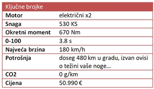 To je glavni nedostatak „električara“ i vjerojatno jedan od razloga zašto će proći još dugo dok ne budu bili adekvatna zamjena za prave poslovne limuzine koje gutaju kilometre i na 130, i 150 i 170 km/h bez prevelike brige od dosegu. Olakšavajuća je okolnost podrška za 150 kW punjenje pa se ta zaustavljanja za punjenje neće rastegnuti unedogled.